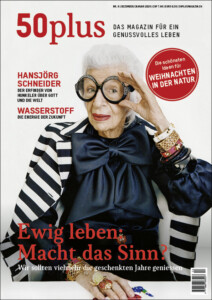 Das hat mich bewogen, unseren Hauptbericht mit einem Fragezeichen zu versehen. Macht es Sinn, sich ein «ewiges» Leben im Diesseits zu wünschen? Gibt nicht gerade die beschränkte Zeit dem Dasein seinen unschätzbaren Wert? Als Aufforderung, DAS Leben zu führen, das man leben möchte. Unser bald 100-jähriges «Covergirl» Iris Apfel hat aus dem Glück der geschenkten Jahre das gemacht, was wir anstreben sollten: die Zeit nicht beliebig verstreichen lassen, sondern unabhängig vom Alter bewusst seinen eigenen Weg zu gehen. Dazu wollen wir Sie als Publikation immer wieder ermuntern.
