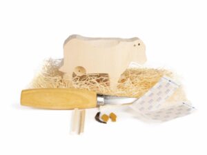Das Set ist für Erwachsene (oder Kinder mit sehr guter Schnitzerfahrung) geeignet. Mit dem scharfen Messer lässt sich der Rohling in den eingezeichneten Richtungen bearbeiten und mit der feinen Messerspitze gelingen selbst kleine Details präzise.